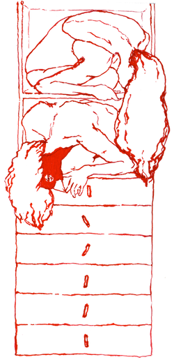 para economizar as folhas restantes do bloco de papel, os trinta e cinco desenhos, todos em lápis e um barato nanquim vermelho - vermelho-fogo, diz o rótulo (um pote cheinho me assegurou que a tinta não acabaria antes de acabarem os desenhos) foram se agrupando em doze folhas. corpos ficaram juntinhos.